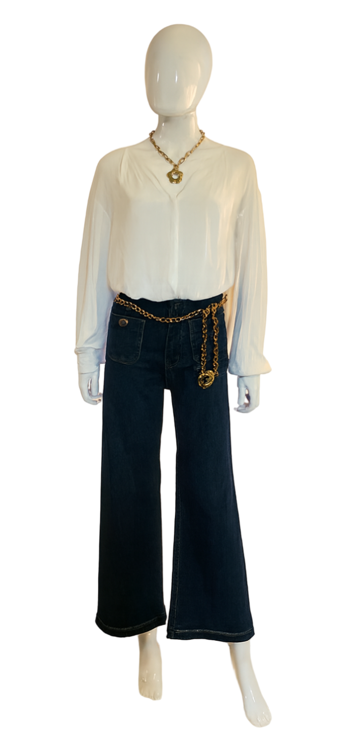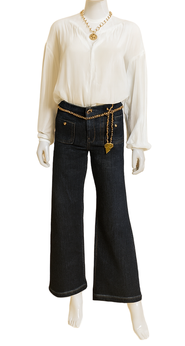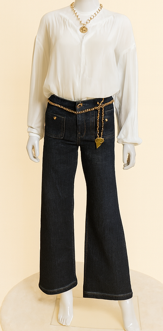 Elle est sublimée par un jean brut taille haute, à la coupe évasée pour allonger la silhouette tout en gardant un style rétro et moderne à la fois.
