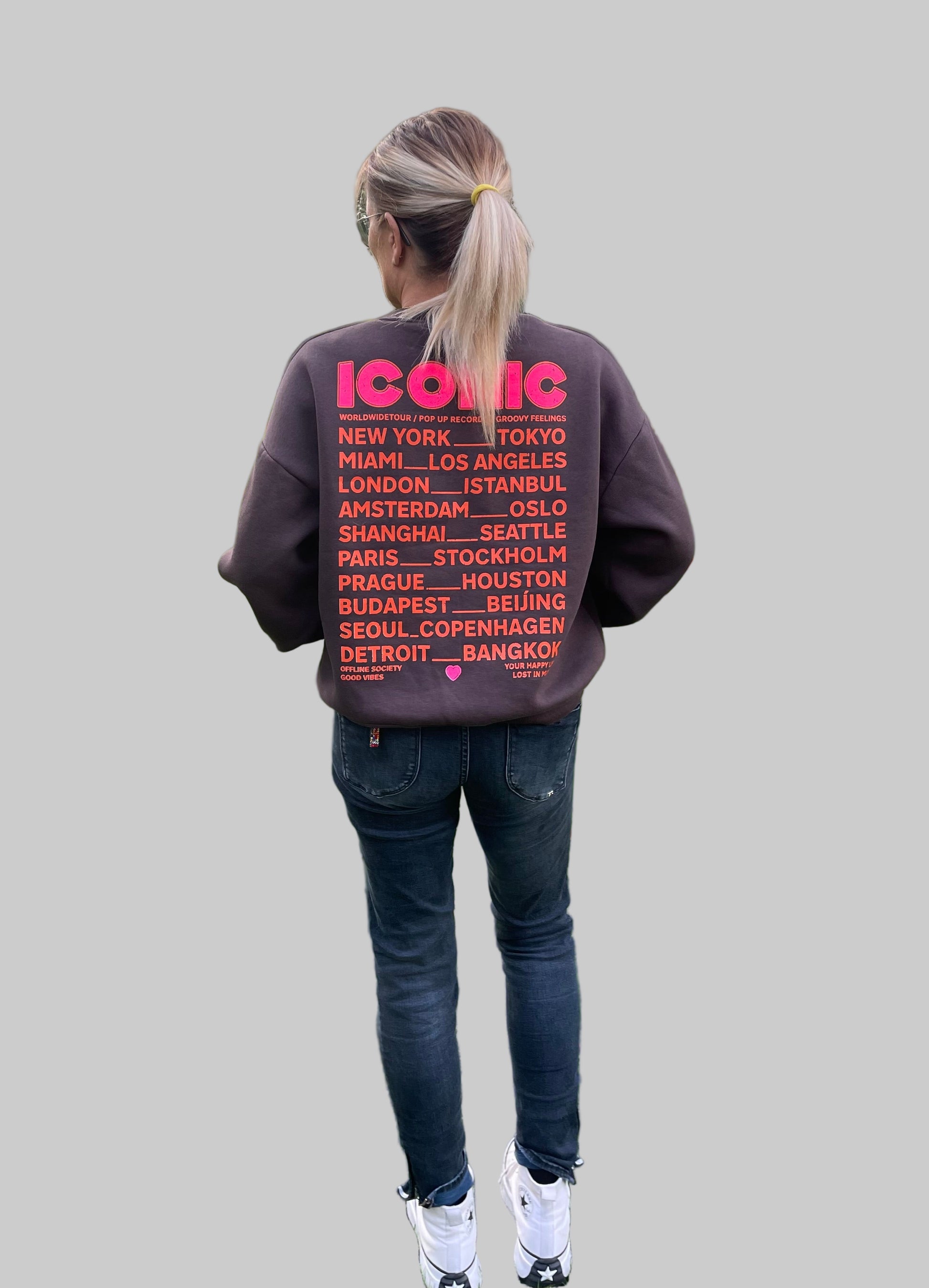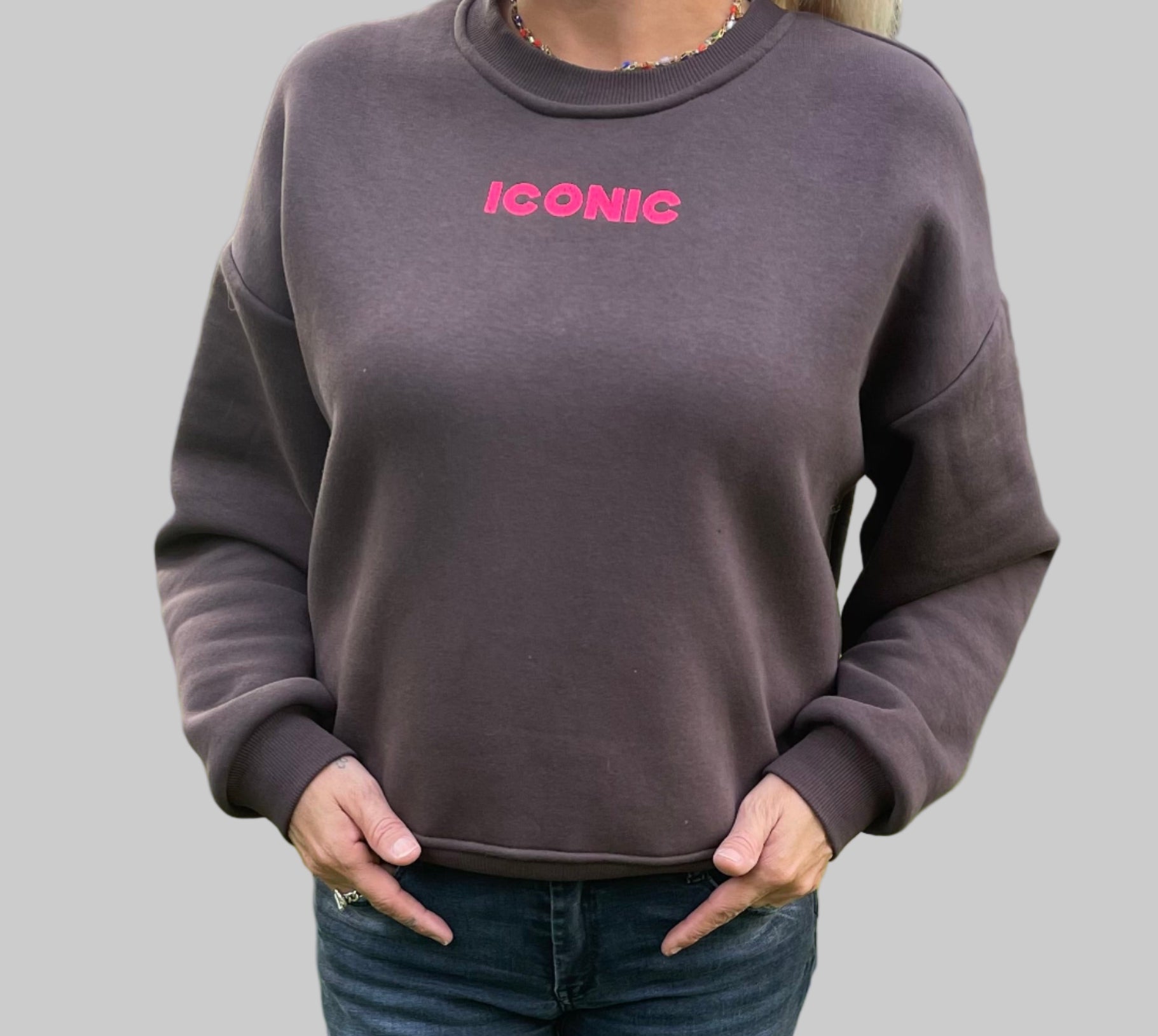 Ce sweat est idéal pour la saison d'automne avec ces couleurs chocolat et rose-orangé.